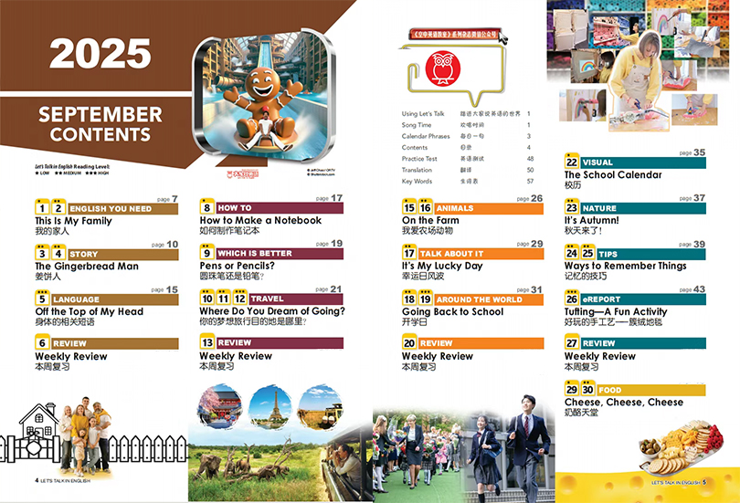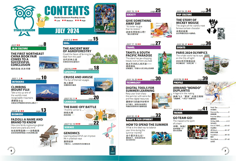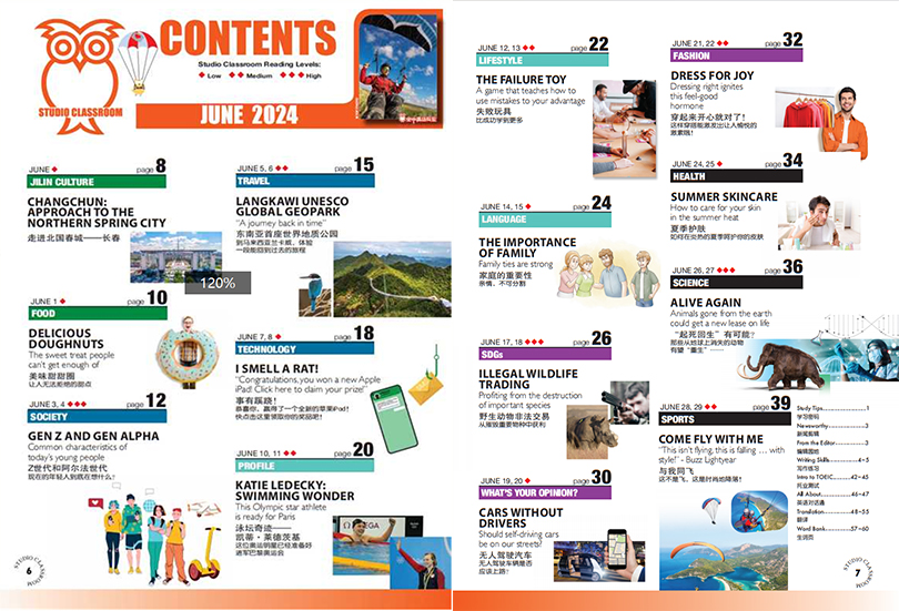 主要栏目:夏日电影推荐、太靠近,心不静?、交换学生日记:佳节文化体验、景点婚礼任你选、《大志》杂志、与“食物”相关的英文短语等。
